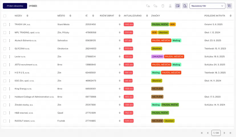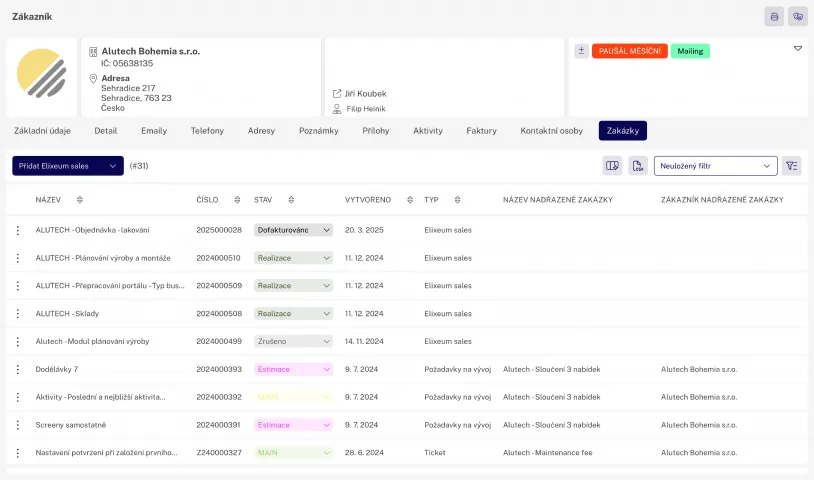 Proto jsme naše webové CRM postavili jako součást komplexního firemního systému, kde se uplatňuje spojení se zakázkami, aktivitami, fakturami, servisními termíny a úplnou historií práce s klienty a jejich pracovníky.