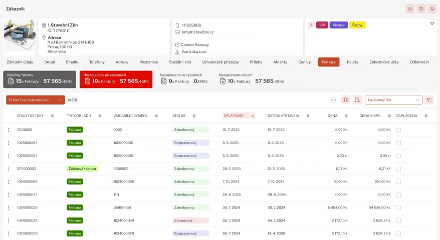 Data v systému jsou propojena tak, že vždy dohledáme kompletní historii obchodní komunikaci, zakázky, faktury i jejich úhrady. Samostatně jsou uloženy dokumenty - smlouvy, protokoly, fotodokumentace.
