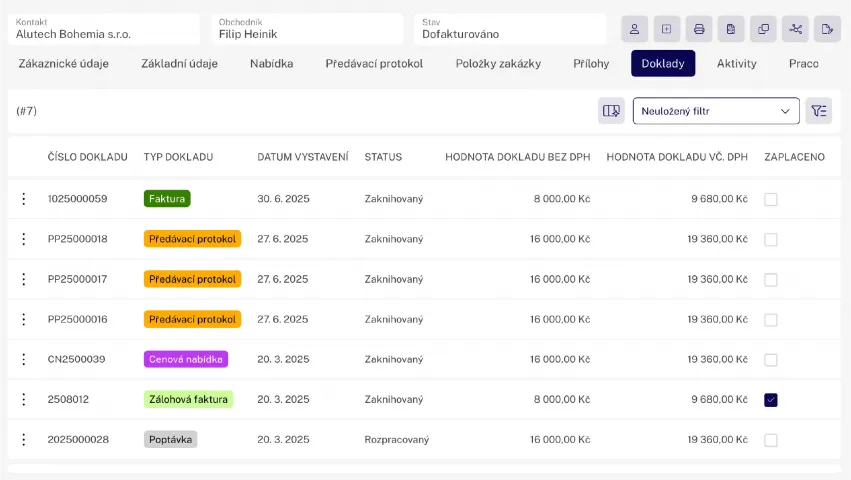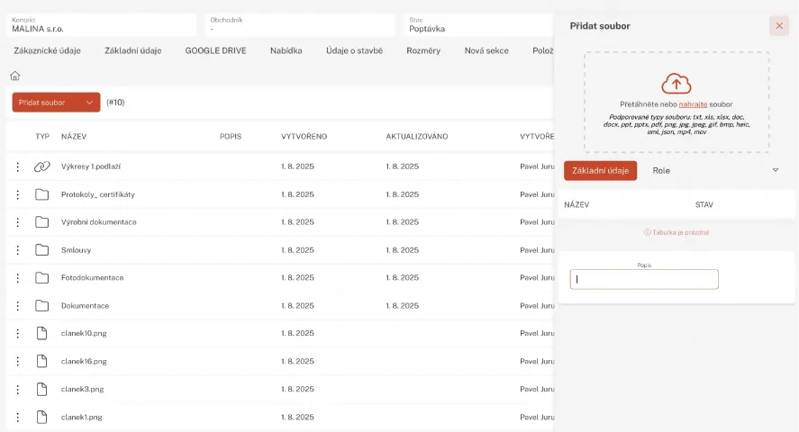 Vkládat dokumenty lze přímo v zakázce, nebo pomocí mobilní aplikace. Dokumentace k zakázce je tak na jednom místě dostupná všem podle přístupových rolí. Ukládáme všechny typy souborů, fotografie, videa, PDF i office soubory. Lze je stahovat, tisknout i posílat emailem.